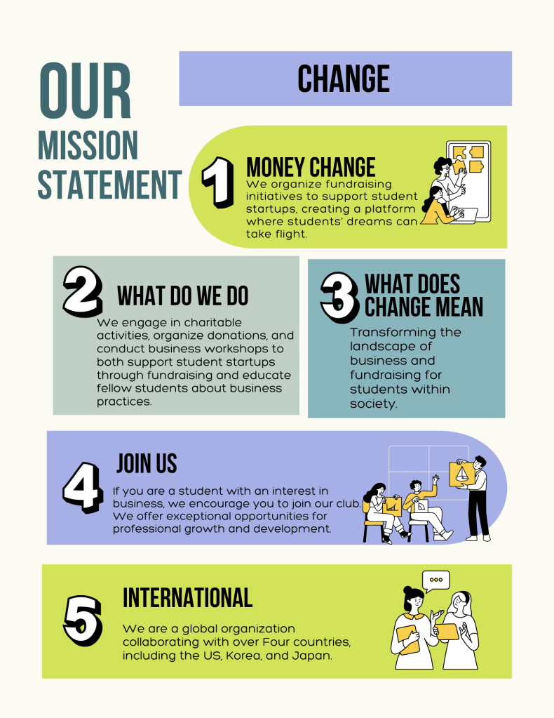 At the end of the year, we will hold a presentation to review our achievements and select new officers. This presentation will also require candidates to propose innovative ideas for future fundraising. Additionally, we will connect with other schools to exchange successful fundraising practices and set ambitious goals for upcoming events. Through these efforts, our club will drive positive change in our community and beyond.